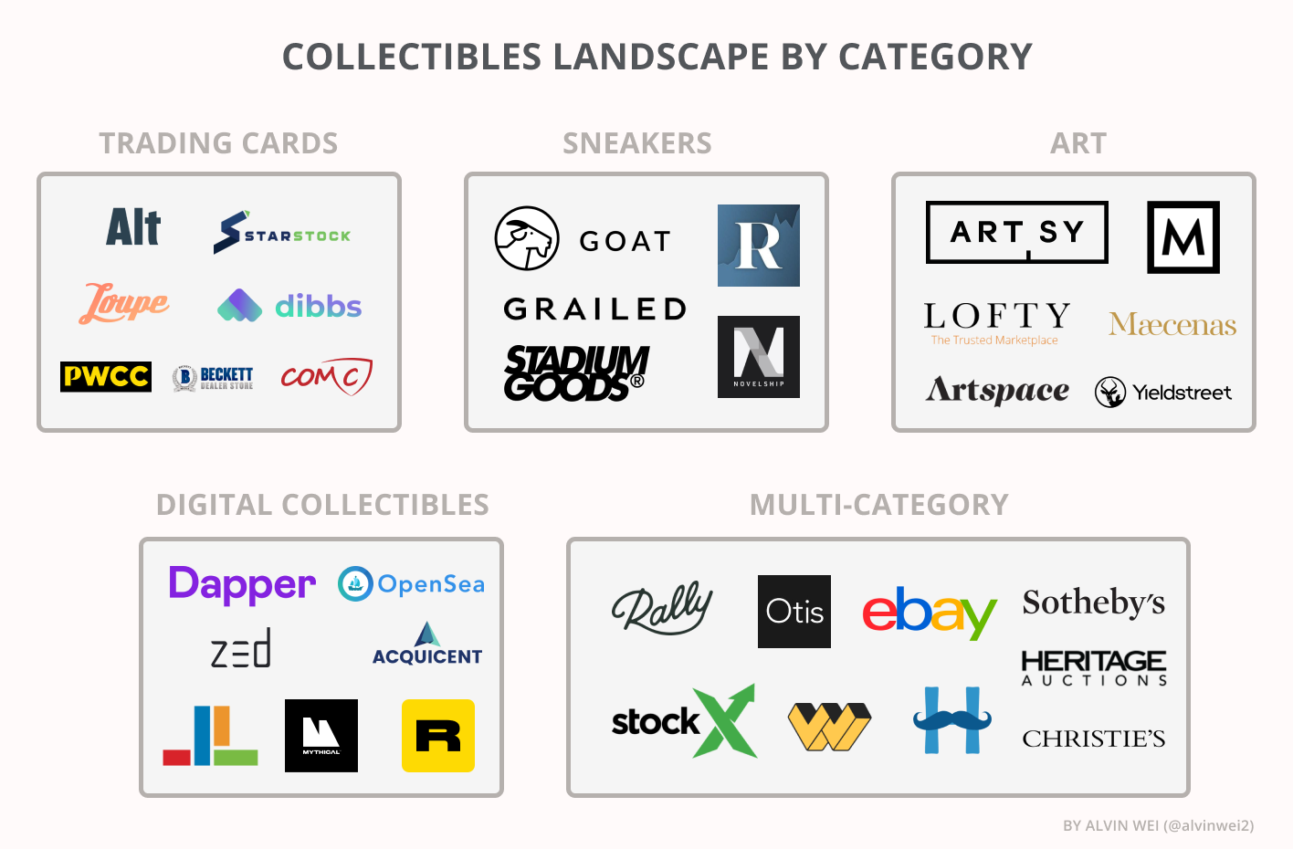 The collectibles market spans from trading cards, sneakers, art, comic books, cars, toys, memorabilia and digital assets. A market mapping by category follows below: